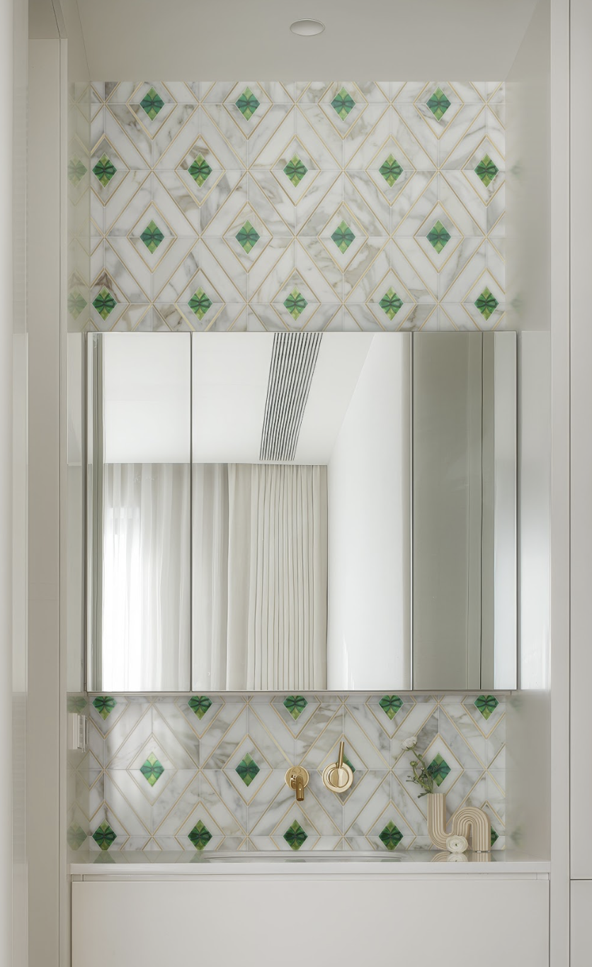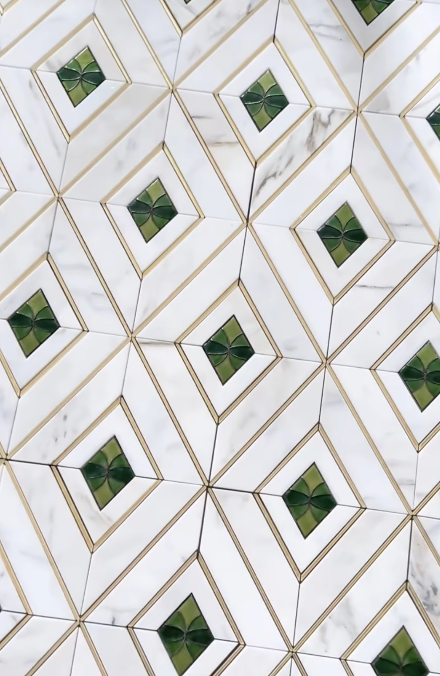 A geometric marble mosaic featuring gold-lined diamonds and vivid emerald centers. Emerald Diamond brings refinement, contrast, and architectural elegance to any space.