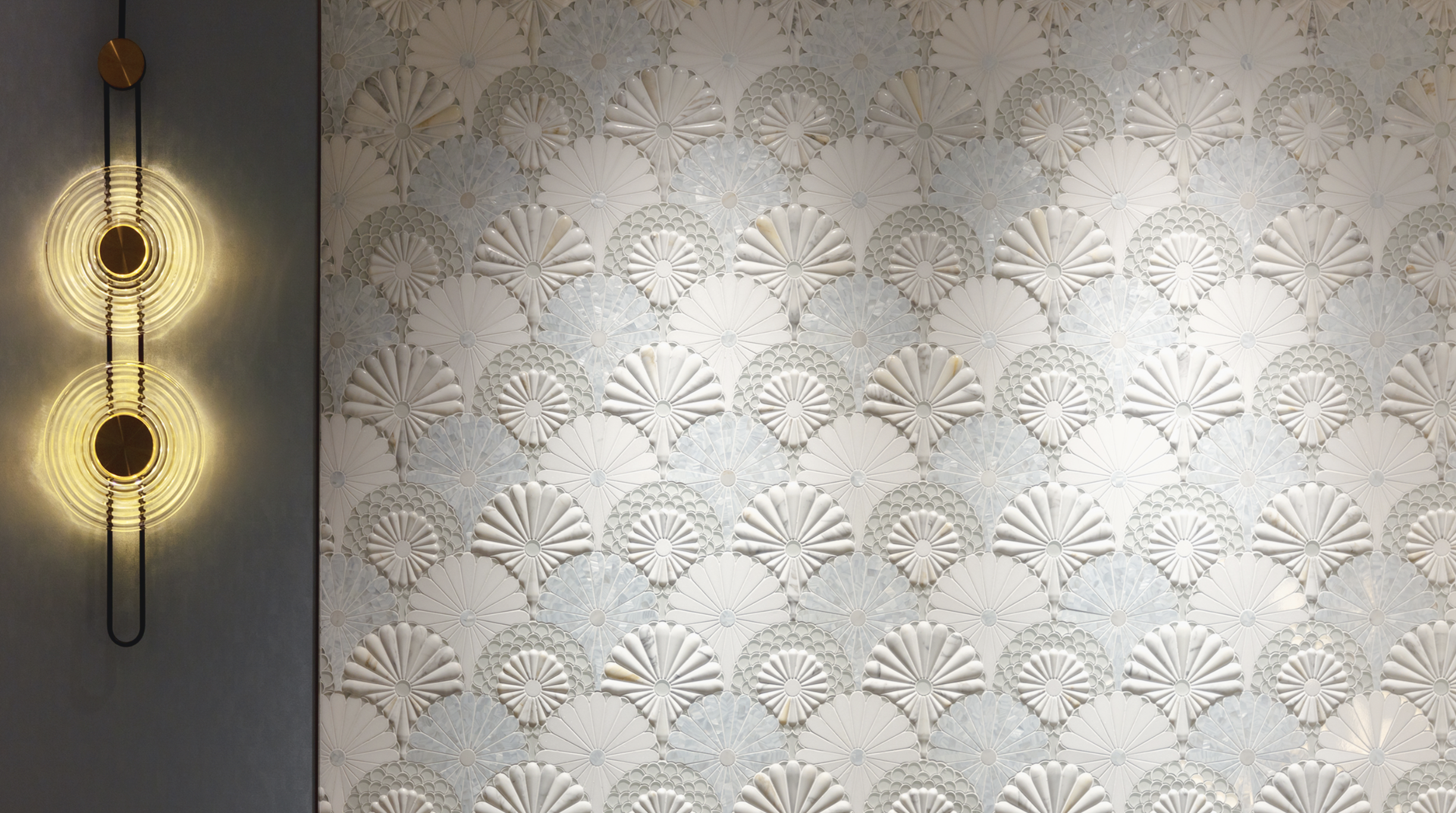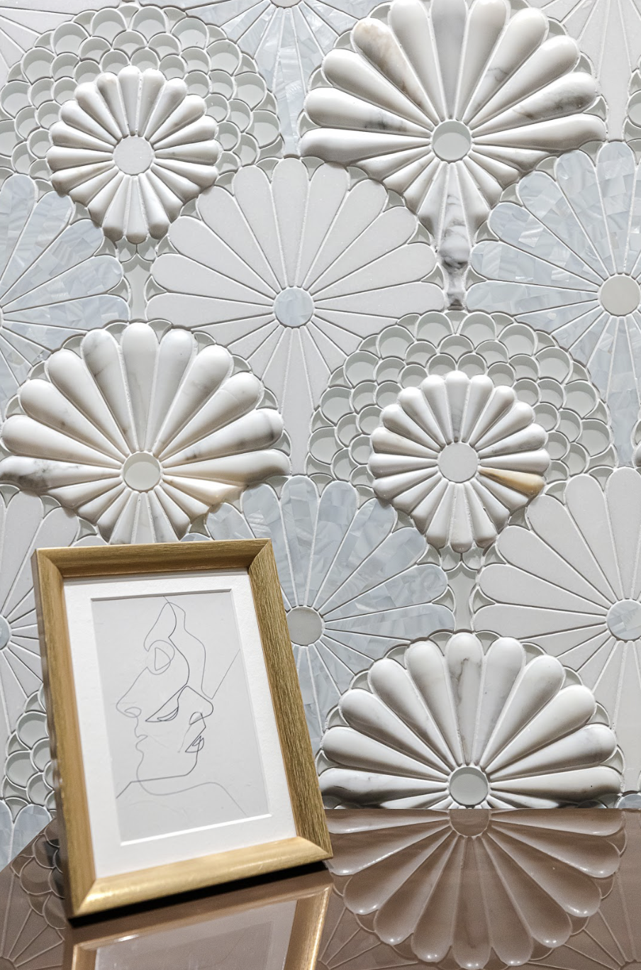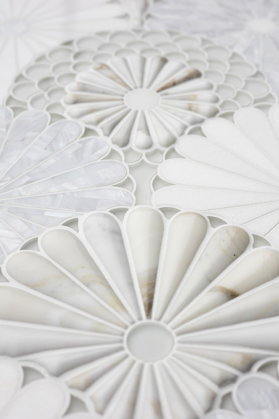 The Fantasy Fan Waterjet Collection transforms natural stone into a work of sculptural art. Inspired by the graceful sweep of hand-held fans and the layered rhythm of floral rosettes, each mosaic radiates outward in a series of delicate, tapered petals. Precision-cut waterjet detailing allows for perfect curvature, seamless transitions, and a dimensional, almost lace-like effect.