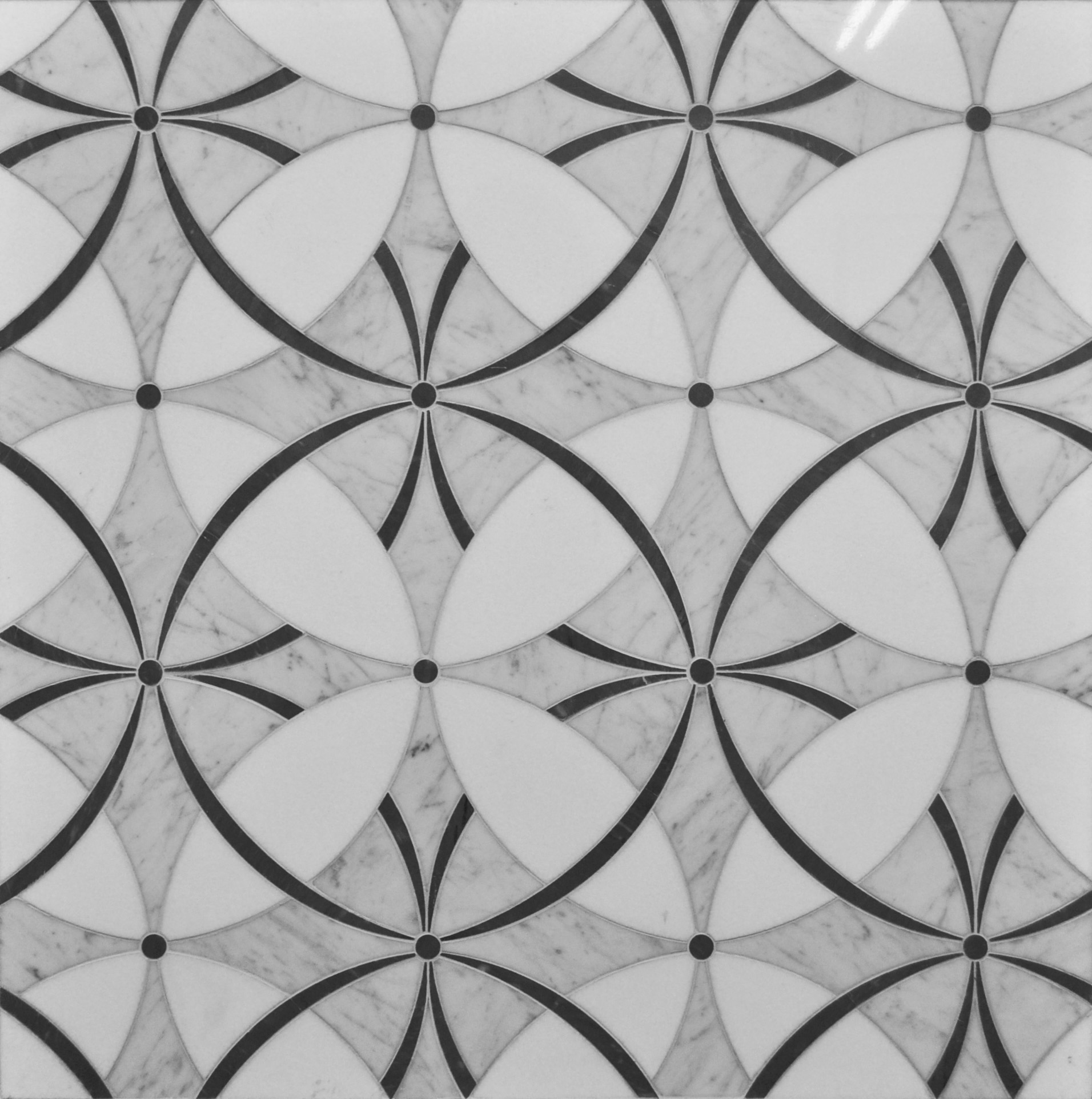 Entwine is a sophisticated geometric waterjet mosaic featuring interlocking petal shapes that form a continuous, rhythmic pattern. Crafted in soft grey and white marble, the design blends symmetry with gentle curvature, creating a timeless, airy backdrop ideal for kitchens, bathrooms, and feature walls. Its seamless flow brings subtle movement and modern elegance to any interior.
